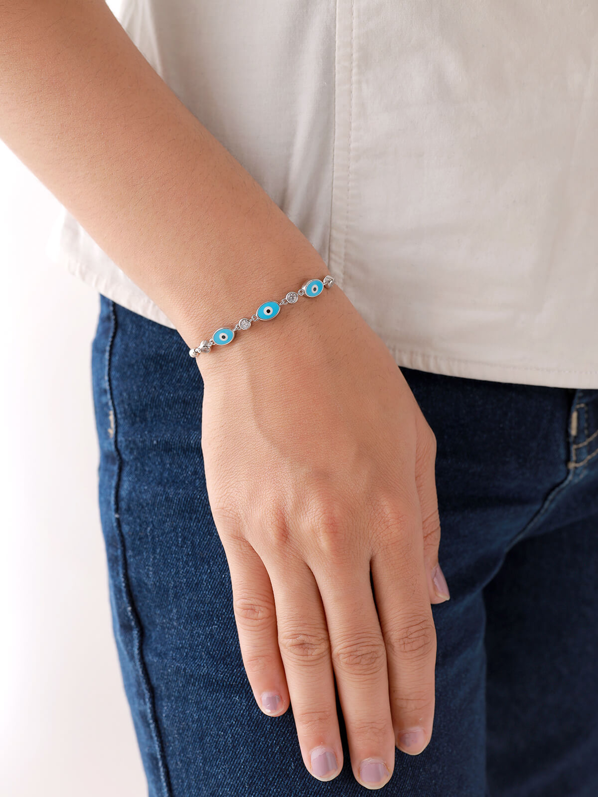 VEKENZA 925 sterling Silver diamond and flower skyblue evil eye Bracelet, Adjustable | Rhodium Plated Women Bracelet, Gifts for Her| Multiple Design Options